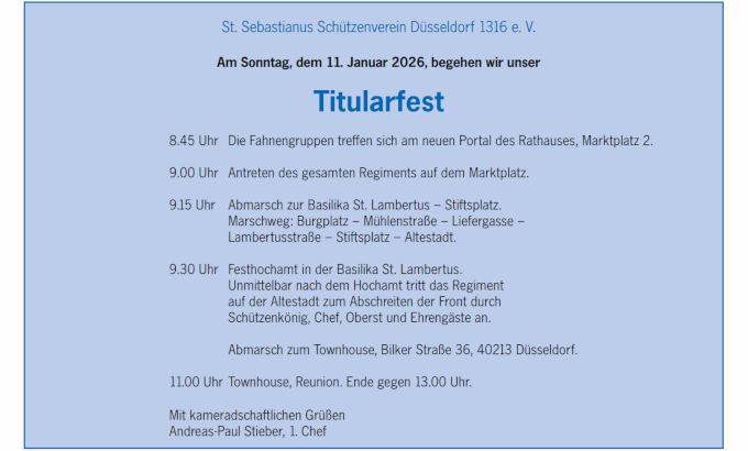 Bericht: Moritz Buschhaus Bilder: Michael Luebke Zum diesjährigen Titularfest 2025 trat das Regiment des St. Sebastianus Schützenvereins von 1316 e. V. am 12.01.2025 um 9 Uhr am Rathaus an. Nachdem die Fähnriche mit den Fahnen der Gesellschaften aufmarschierten, begrüßte Oberst Torsten Peters das Regiment und den anwesenden Vorstand. Weiterhin